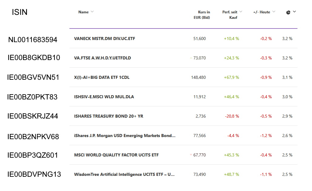 Die größten Positionen im Wikifolio sind derzeit zwei dividendenfokussierte globale Aktien-ETFs, gefolgt von einem KI-fokussierten ETF, Multi-Faktor-ETF und zwei Anleihen-ETF (USA und Schwellenländer).