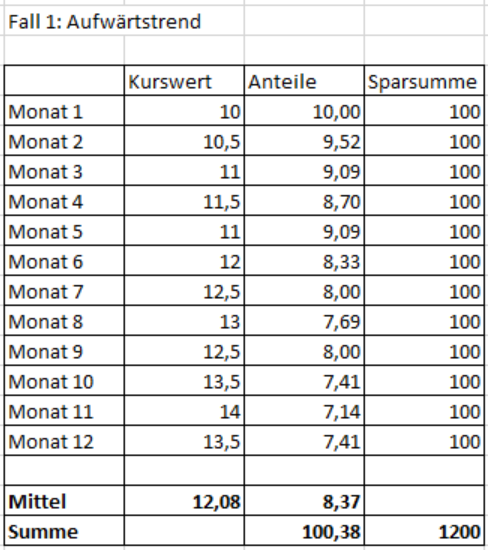 Der Kurswert des Investments steigt im betrachteten Zeitraum von 12 Monaten von 10 Euro auf 13,50 Euro. Da die Sparsumme immer identisch bei 100 Euro liegt, erhält unser Anleger pro Kauf auch immer weniger Anteile. Im Durchschnitt hat er nun das Investments für 12,08 Euro gekauft und damit 100,38 Anteile erworben. Rückblickend betrachtet war dieses Vorgehen nicht der optimale Weg, da er mit einer kompletten Einmal-Investition seine Wertpapiere für 10,00 Euro erhalten und 120 Investment-Anteile erworben hätte.