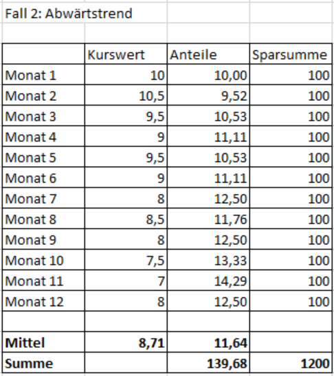 Cost-Average-Effekt – Beispiel bei einem Abwärtstrend