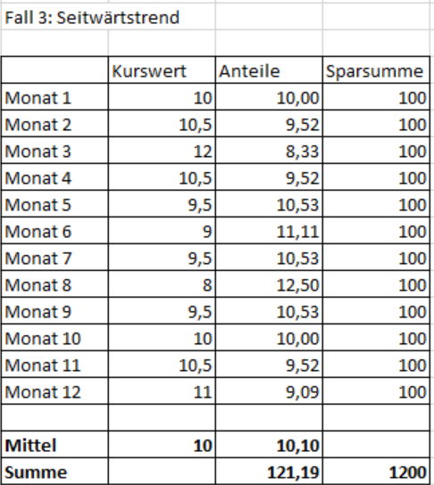 Der Kurswert des Investments schwankt im betrachteten Zeitraum von 12 Monaten um den Wert von 10 Euro. Da die Sparsumme immer identisch bei 100 Euro liegt, erhält unser Anleger pro Kauf unterschiedlich viele Anteile. Im Durchschnitt hat er nun das Investments für 10,00 Euro gekauft und damit 121,19 Anteile erworben.