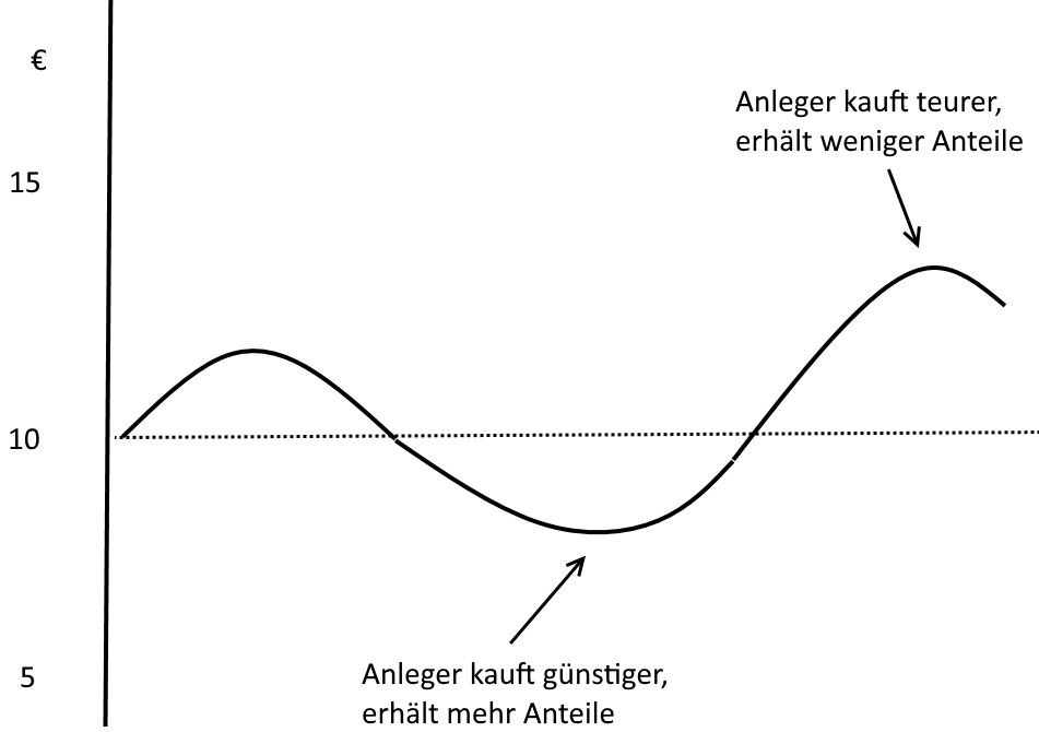 Cost-Average-Effekt – Ein Anleger verhält sich antizyklisch und erwirbt mehr Anteile bei niedrigen Kurswerten und entsprechend weniger Anteile, wenn das Investments teurer ist.