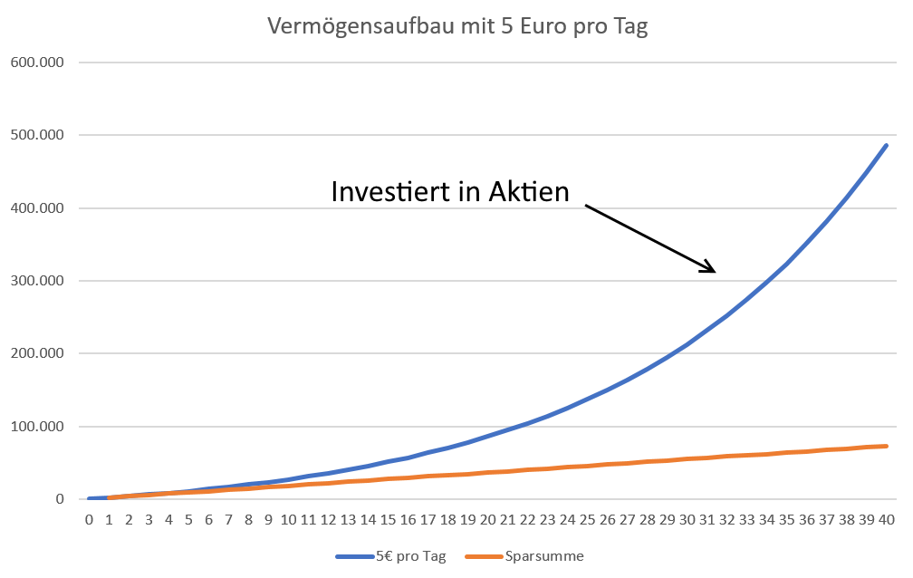 Unterschied zwischen 5 Euro pro Tag sparen (orange Kurve) und 5 Euro pro Tag in den globalen Aktienmarkt investieren (blaue Kurve). Je mehr Jahre vergehen, desto drastischer wirkt sich der Effekt des Zinseszinses aus.