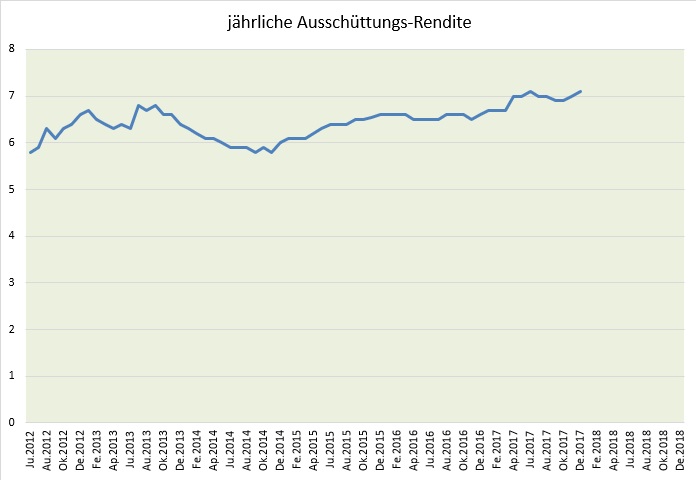 Die Ertragsausschüttung des Muster-Depots lag Ende Dezember 2017 bei 7,1% p.a. Das ohnehin schon hohe Niveau der Dividendenzahlung und Zinszahlung wurde somit bestätigt. Im Jahr 2018 wird dieses Niveaus nicht ganz gehalten werden können, denn im im April 2017 gab es bei einigen Aktien-ETFs von iShares eine Sonderausschüttung, weshalb das Niveau der Ausschüttungsrendite im Frühjahr und Sommer 2018 leicht absinken dürfte.