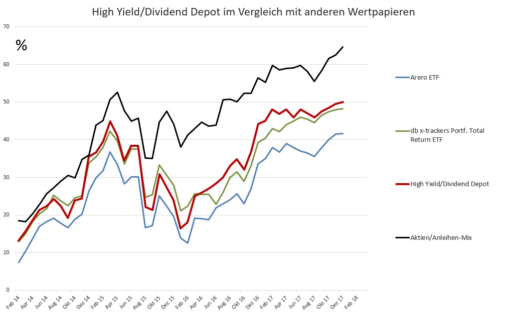 Zu sehen ist in der nächsten Grafik jeweils die Gesamtperformance in Prozent – also Kursveränderung plus Ausschüttungen. Start war bereits der Juli 2011 und die Werte zum Start sind bekannt, jedoch sind von 2011 bis 2013 zu viele Monate dabei, in denen die Gesamtperformance nicht explizit festgehalten worden ist. Aus diesem Grund beginnen diese Investments in der Grafik auch nicht am selben Ausgangswert, was sie jedoch tatsächlich im Juli 2011 getan haben. Das High Yield/Dividend Depot ist an der roten Kurve zu sehen.