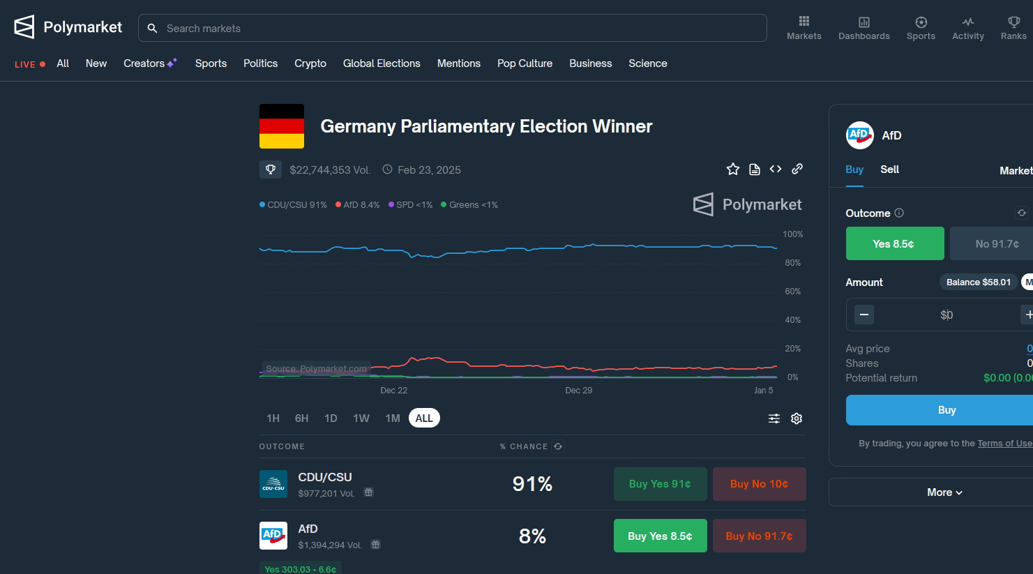 - Registrierung und Einzahlung: Um auf Polymarket wetten zu können, müssen Nutzer zunächst ein Konto erstellen und ihre Krypto-Wallets mit USDC aufladen. Die Plattform bietet eine intuitive Benutzeroberfläche, die es Nutzern ermöglicht, auf verschiedene Märkte zuzugreifen und ihre Wetten zu platzieren.
