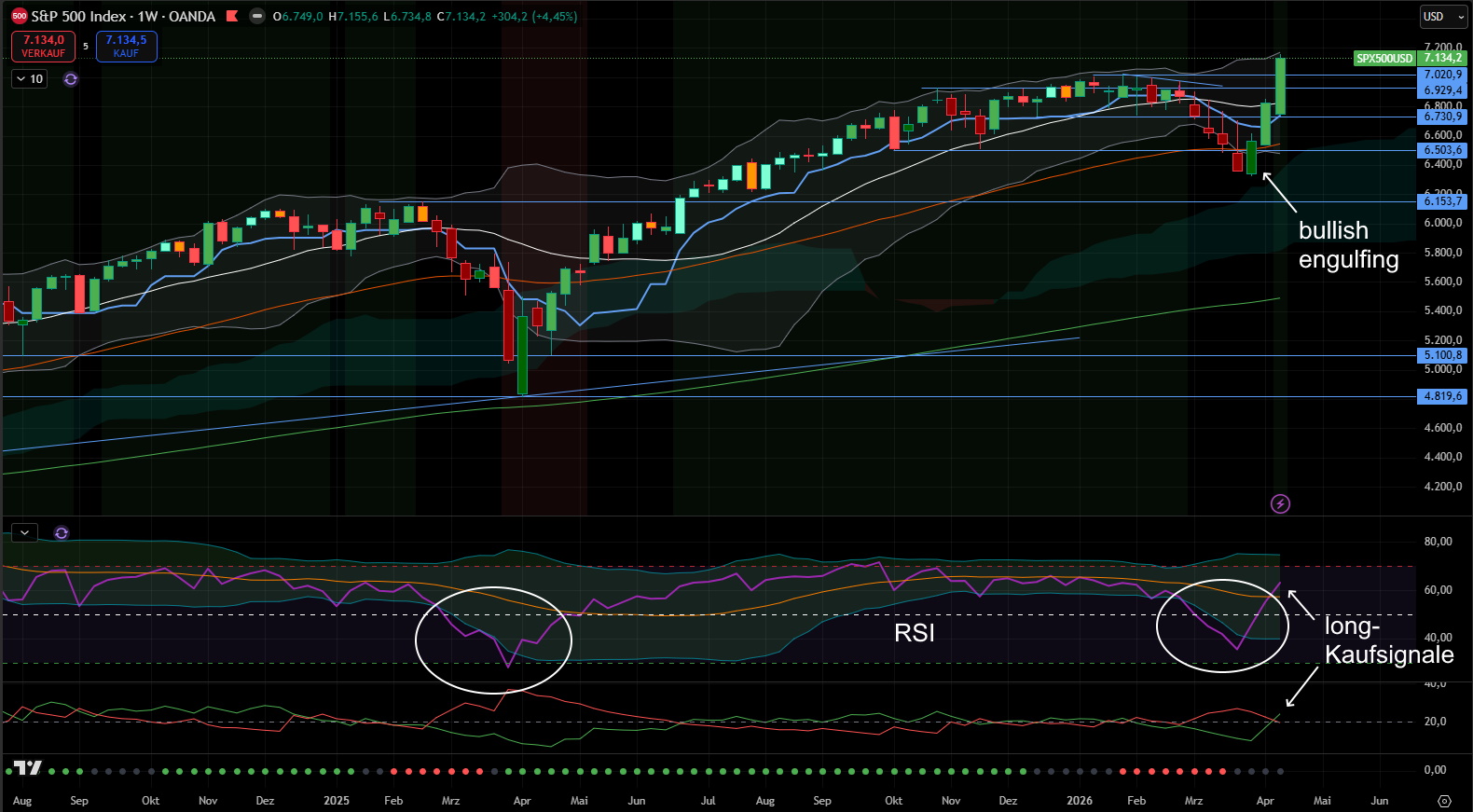 Aus der Sicht der Technischen Analyse erzeugte dieser Kursrückgang im Februar und März 2026 nach der langen Seitwärtsphase eine Übertreibung. Diese konnte man im Zwei-Wochen-Chart des S&P 500 am deutlichsten erkennen und hatte das Niveau vom Corona-Crash 2020 und der Zollthematik im Frühling 2025. So überschritt der RSI seine Bollinger Bänder markant nach unten, was aus technischer Sicht im Standardfall eine deutlich Gegenbewegung erzeugt. Diese Gegenbewegung mündete 2020 und 2025 jeweils in einen längeren Aufwärtstrend.