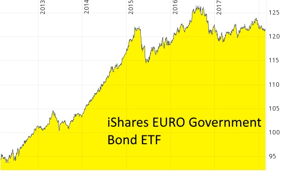 Der Performanceindex inklusive ausgezahlter Zinsen bei einem Anleihen-ETF mit Staatsanleihen aus der Eurozone von 2012 bis 2018. Quelle: Comdirect.de