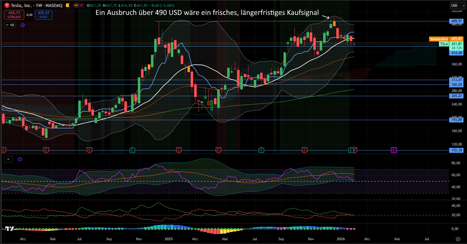 Charttechnisch steht Tesla an spannender Marke